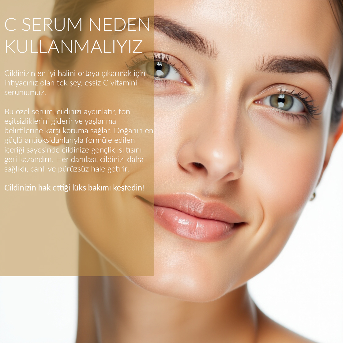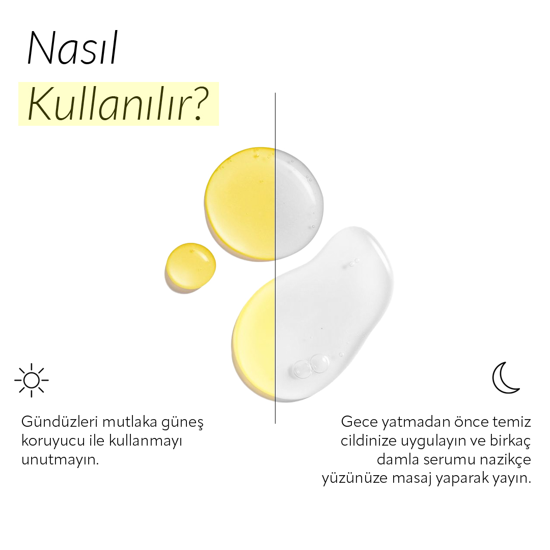 %20 saf C vitamini, glutatyon ve gliserin içeren güçlü formülüyle cilt tonunu eşitler, leke ve ince çizgi görünümünü azaltır. Cilde yoğun nem, ışıltı ve pürüzsüzlük kazandırırken, çevresel etkenlere karşı yüksek antioksidan koruma sağlar. Tüm cilt tiplerine uygundur; düzenli kullanımda daha aydınlık, sağlıklı ve genç bir cilt görünümü sunar.